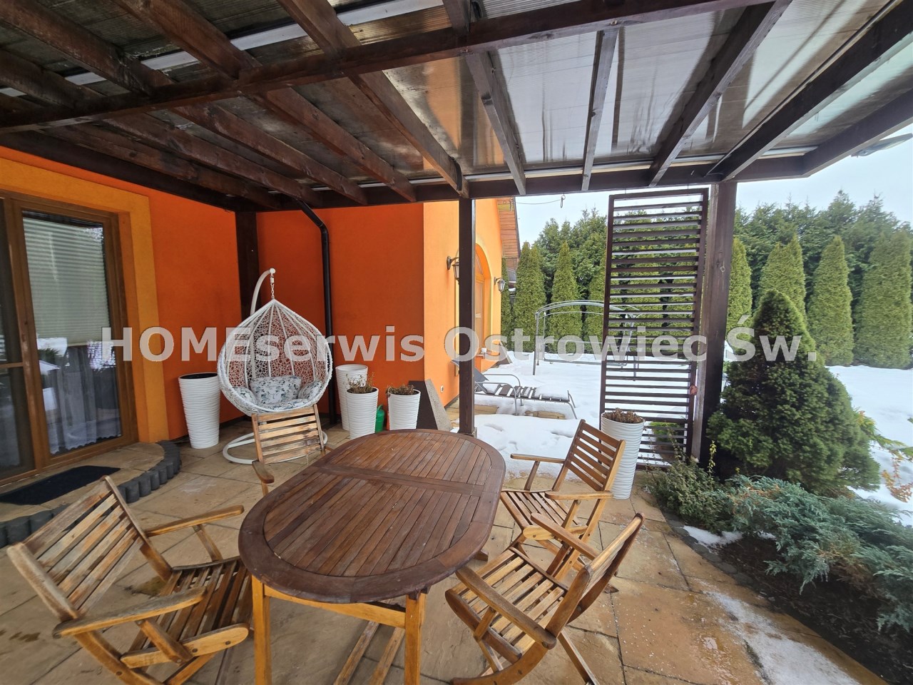 Dom częściowo podpiwniczony, garaż w bryle budynku, za domem duży taras z widokiem na obszerny ogród z zabudową do zabaw dla dzieci.