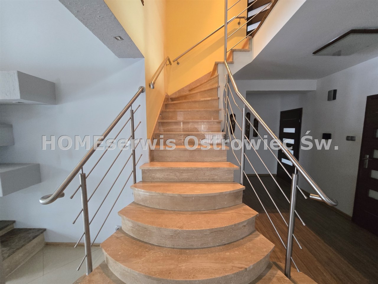 Na piętro prowadzą schody marmurowe z podświetleniem LED, na piętrze znajdują się 3 sypialnie, hol oraz duża łazienka, salon zatem z piętrem zwieńczony jest antresolą, co stanowi urozmaiconą architekturę wewnętrzną.
